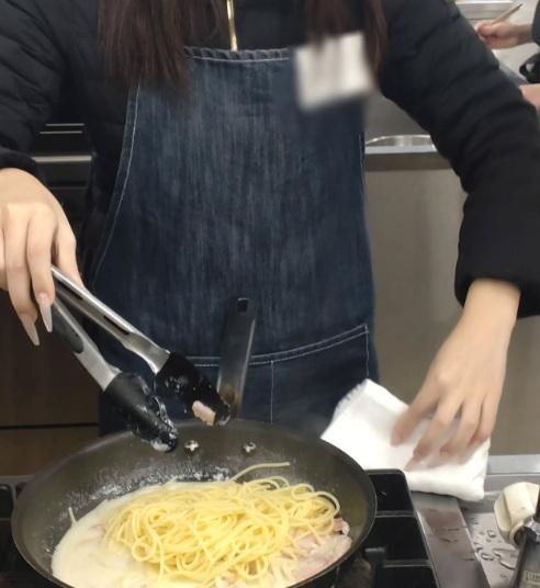 本日の体験レシピはスパゲッティ・カルボナーラ♪
