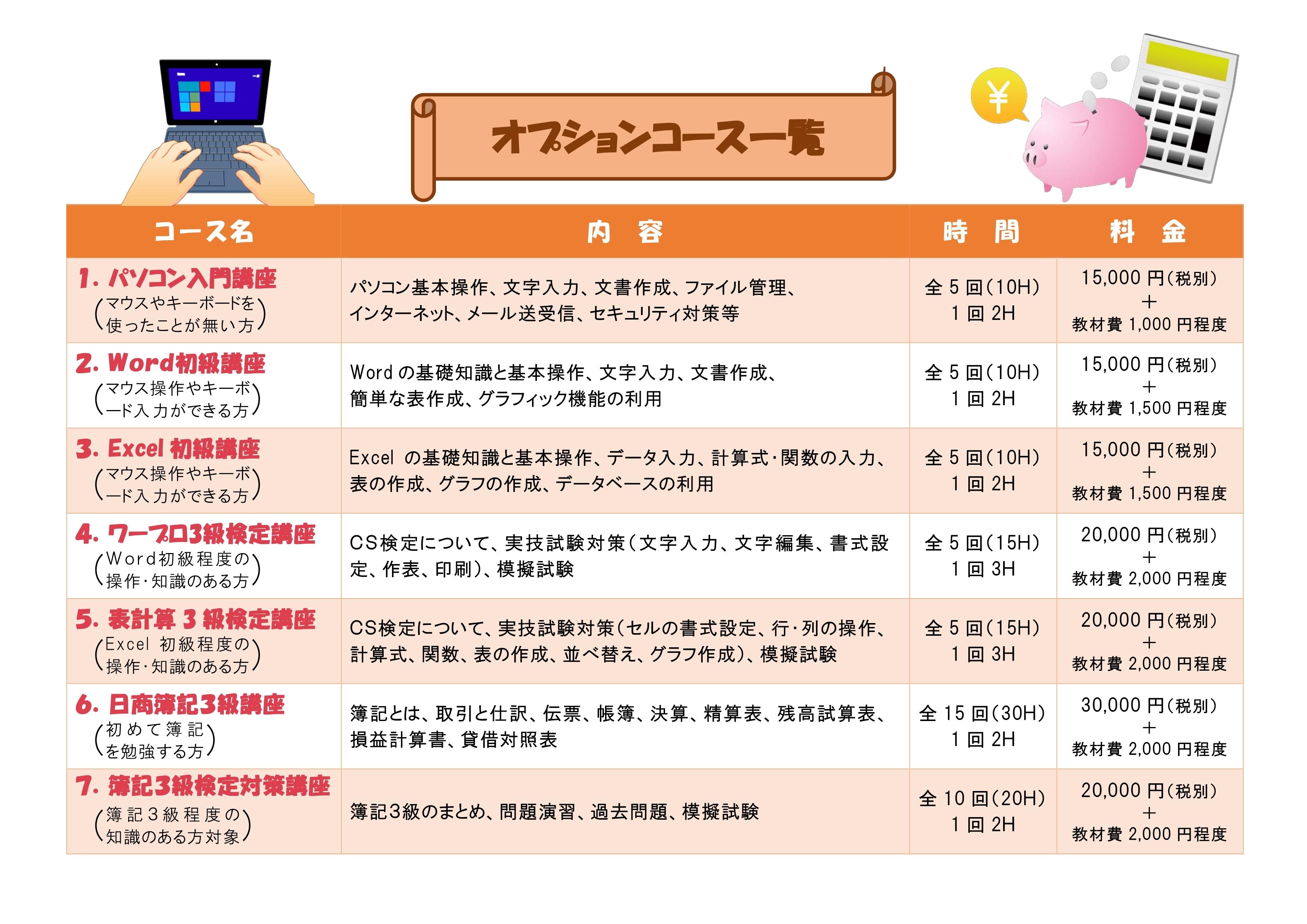 オプション講座社会人を対象とした、公共職業訓練の実績が豊富な弊社ならではの、パソコンスキルアップの講座も充実しています。